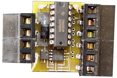 This 1-wire card uses the DS2450 IC in the output mode to turn four digital signals on and off. The output is buffered with an open collector 7407 IC that can be used to control DC relay coils at up to 35V at 24 mA each. It can also be connected to the RELAY4B. This board accepts four optically isolated solid state relays. These can be any combination of an OAC5A (switches 24 to 240VAC at up to 3 amps) or an ODC5A (switches 4 to 200VDC at up to 1 amp).